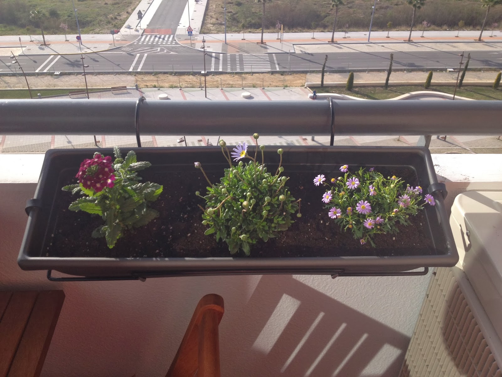 Yesterday we headed to Spain's answer to Home Depot: Leroy Merlin, where we bought a few hanging planters. This morning we went to our local market to try to find some sun-loving plants and were successful. The stand that we visited had a lot of different things to choose from but I wanted to get plants that would flower and give us a bit of color out on our terrace. After coming home we transfered them and voila!